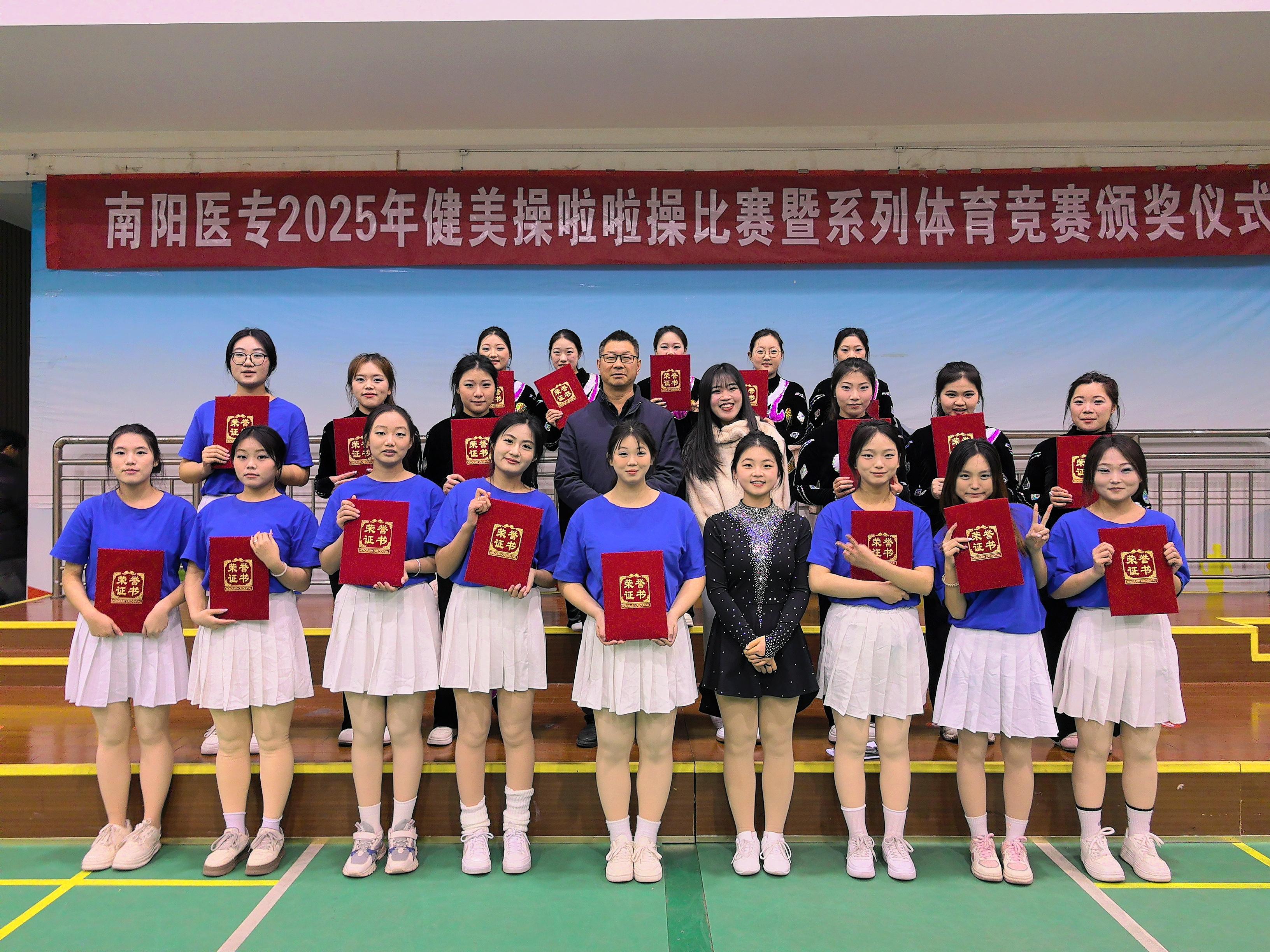 12月25日下午,南阳医专2025年健美操啦啦操比赛暨系列体育竞赛颁奖仪式在校体育馆圆满举办,校党委副书记刘涛,党委委员、副校长刘荣志、副校长王岩出席活动,学校相关部门负责同志、各系(部、院)负责人、裁判员、工作人员及各系参赛运动员齐聚现场,共同见证青春风采与荣耀时刻。