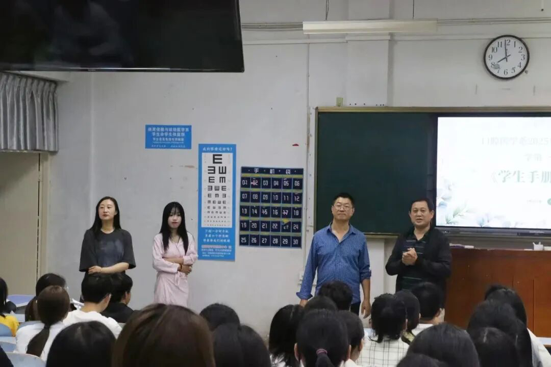 2025年9月6日晚,口腔医学系2025级新生开学第一课主题班会在各班级教室举行。系党总支书记余飞海、副书记程安琪、学工办主任原莹及新生班辅导员与全体新生共同开启大学生涯首场“启蒙课”,为新生快速融入校园生活奠定基础。