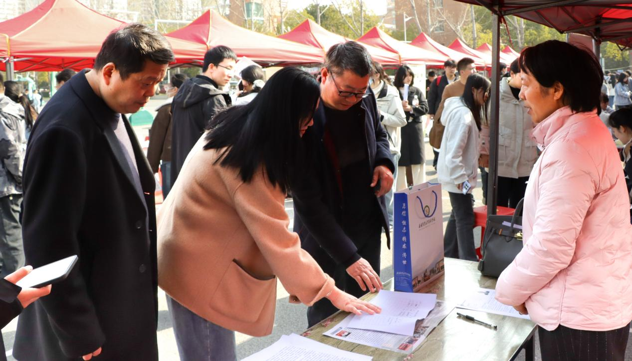 系党总支书记余飞海、主任王照林、副书记程安琪、学工办主任原莹及系全体职工在各展位前了解用人单位需求,推动校企供需精准对接、全力助推毕业生高质量就业。
